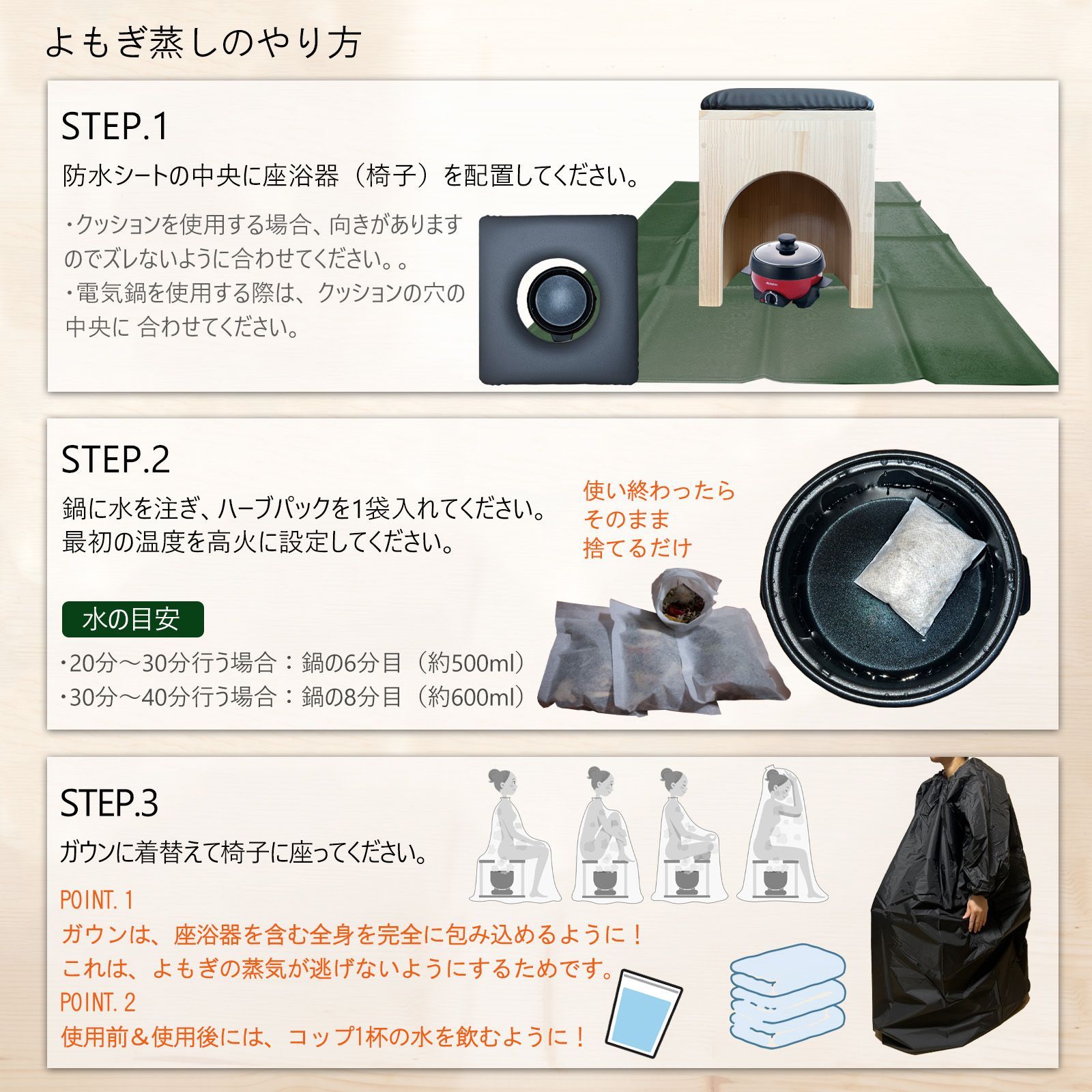 ●届いてすぐに使用できるよもぎ蒸し座浴6品セットです。