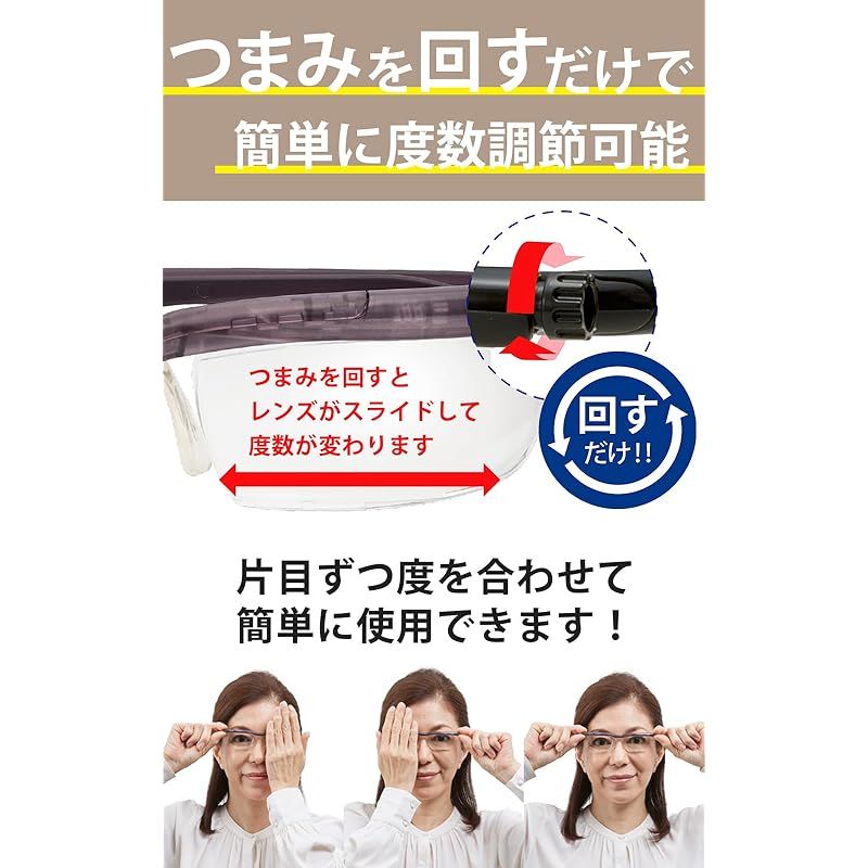 視力に合わせて+0.5D~+4.0Dまで度数を調節できるシニアグラスです。